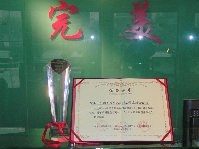 典礼上,上海市领导为获得上海市“十大无偿献血杰出单位”荣誉称号的完美上海分公司、上海市红十字血液中心、上海交通大学、中国移动上海有限公司、宝钢集团等十家单位颁发了奖杯与证书。在市政府翁铁慧副秘书长热情的致辞后,作为唯一的获奖单位代表——完美上海分公司郑希英经理上台接受了现场采访。郑经理在发言中介绍了完美公司自1999年以来,每年都举办无偿献血活动,“完美百城千店万人献血活动”也已举办到第五届,今年还赞助了无偿献血“生命奖牌”的制作。并将古董事长对于献血活动的感言:“奉献永无止境,既然不知不觉已经做了十年,那么我们也有信心再做十年、二十年,只要社会需要,我们就一直坚持下去。”带给了全场的嘉宾。完美公司的人道义举赢得了社会各界的普遍赞誉,全场响起了热烈的掌声。