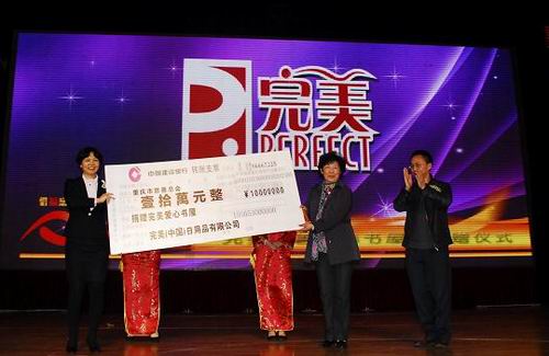 2011年3月6日下午,完美公司“慈善爱心书屋”捐赠仪式在重庆市人民大礼堂隆重举行。重庆市民政局原局长佘明哲,重庆市慈善总会副会长兼秘书长徐幼琴,腾讯大渝网总编辑钟剑等领导出席了捐赠仪式,与现场3000多名完美人共同见证了这个庄严的时刻。