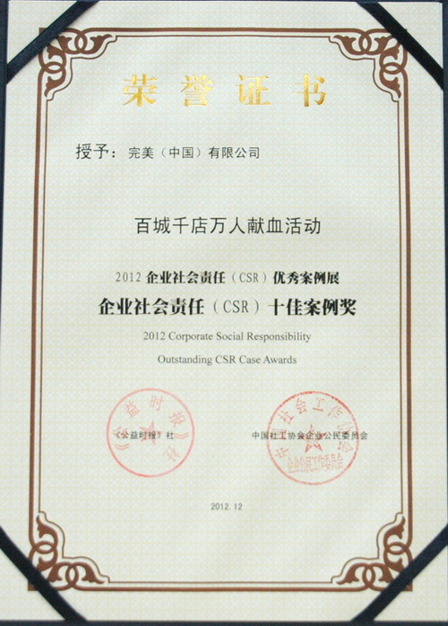 完美荣获企业社会责任(CSR)十佳案例奖