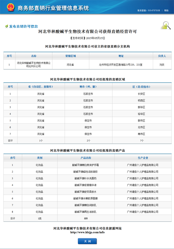 商务部公示河北华林酸碱平生物技术有限公司获直销经营许可