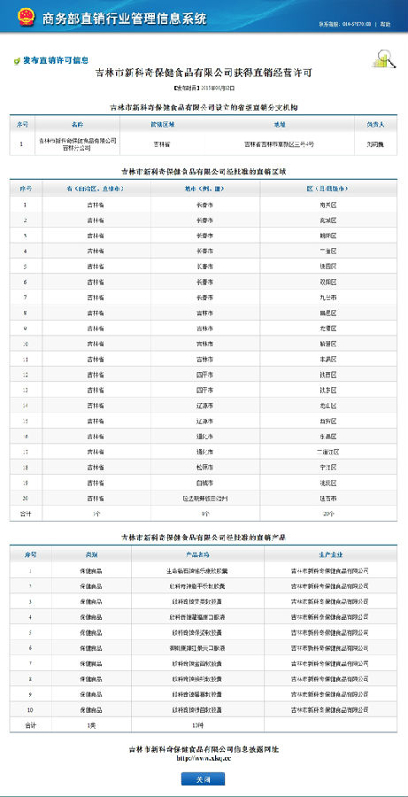 直销行业网讯 2015年6月12日,商务部直销行业管理网站公布:吉林市新科奇保健食品有限公司正式获得直销经营许可。同时,新科奇还获得包括长春市、吉林市、四平市等在内的20个区(县)的直销经营许可,其直销产品则是生命钻石牌愉乐康软胶囊、欣科奇牌脂平乐软胶囊、欣科奇牌艾美软胶囊等10种保健食品。详细情况如下图: