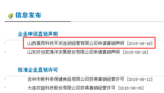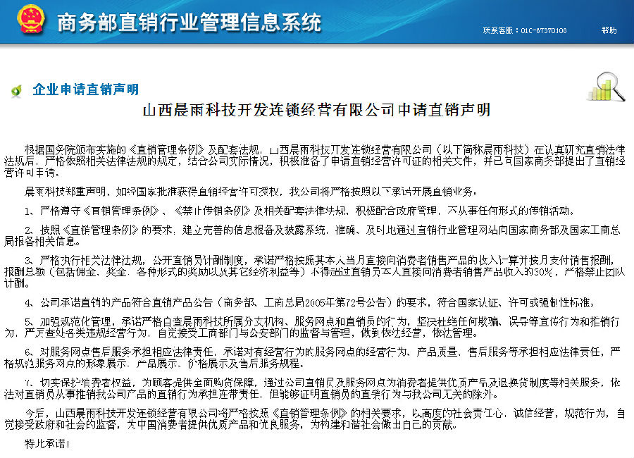 直销行业网讯 2015年6月19日,商务部直销行业管理信息系统发布了山西晨雨科技开发连锁经营有限公司申请直销声明。2015年商务部直销行业管理信息系统已经发布了9家企业的申牌声明。详情如下: