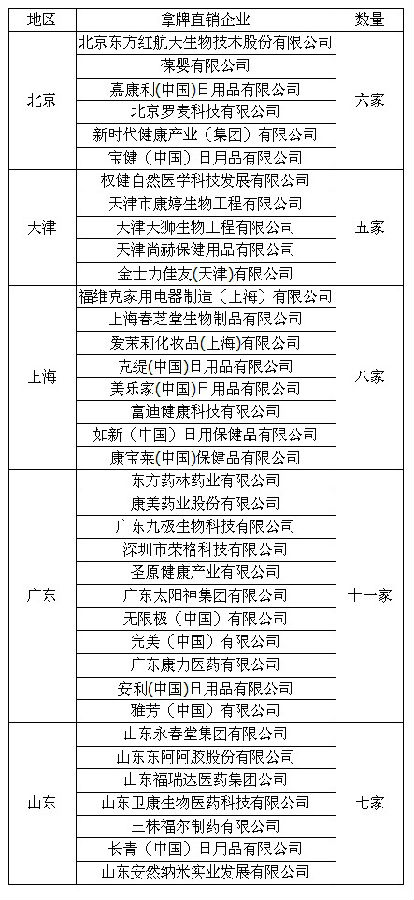 统计显示,目前广东位列第一拥有11家拿牌直销企业,上海其次拥有8家拿牌直销企业,山东暂列第三拥有7家拿牌直销企业,北京第四拥有6家拿牌直销企业,天津第五拥有5家拿牌直销企业。