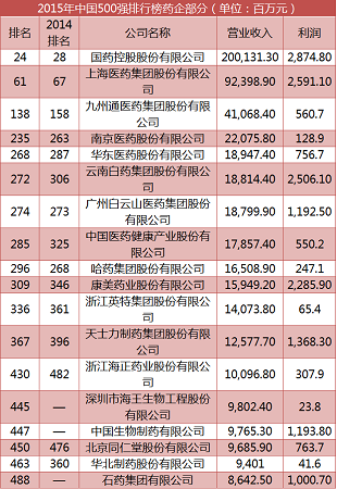 在今年的500强中,共有18家药企上榜,国药控股有限公司以2000亿元的收入位列18家药企之首,也是前50强中唯一的医药企业。上海医药集团股份有限公司以924亿元的收入紧随其后,成为百强行列中的另一药企成员。