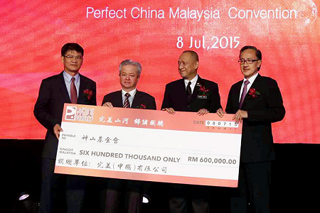 会上,完美公司向马来西亚乒乓球总会捐赠500万马币,用于支持2016年吉隆坡世界乒乓球锦标赛。2015年6月5日,马来西亚沙巴州发生6级地震,导致马来西亚神山局部坍塌,造成一定数量的人员伤亡。为了帮助东马沙巴地震灾区重建,完美公司向神山基金会捐赠60万令吉。