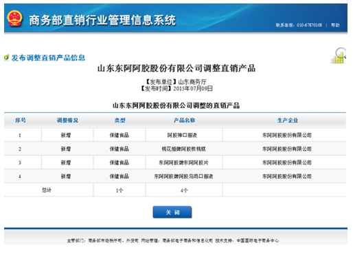 直销行业网讯 7月13日,商务部直销行业管理信息系统公布了山东东阿阿胶股份有限公司调整直销产品的信息,东阿阿胶新增加保健食品类4个直销产品,新增产品包括阿胶神口服液、桃花姬牌阿胶核桃糕、东阿阿胶牌东阿阿胶片、东阿阿胶牌阿胶乌鸡口服液等。具体如下: