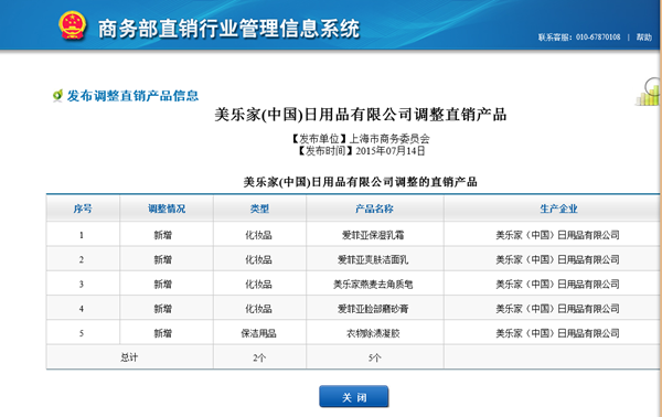 直销行业网讯 商务部于7月14日发布了美乐家(中国)日用品有限公司调整直销产品信息。