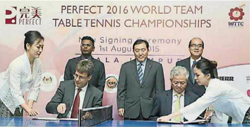 直销行业网讯 8月1日,马来西亚乒乓总会在吉隆坡举行新闻发布会,与国际乒乓联合会签署谅解备忘录,正式接过赛事主办权,并确定完美公司成为赛事的冠名赞助商。古润金董事长代表马来西亚乒乓总会与国际乒联主席托马斯·维克特、世乒赛筹委会主席韩琚元签署备忘录。这是继2000年之后,马来西亚再次承办世界乒乓球团体锦标赛,赛事将于2016年2月28日至3月6日在马来西亚雪兰莪莎阿南美拉华蒂体育馆举行,届时将有男、女各96支国家代表队参赛。