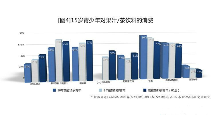 同时, 零零后也是关注健康的一族,他们对食品健康有着很强的关注度,十年间,较为健康的饮品,比如100%纯果汁、茶饮料、果蔬饮料消费分别上升17个、13个和11个百分点。而对西式快餐、可乐和速溶咖啡的消费分别下降5个、13个和9个百分点[见图4]。