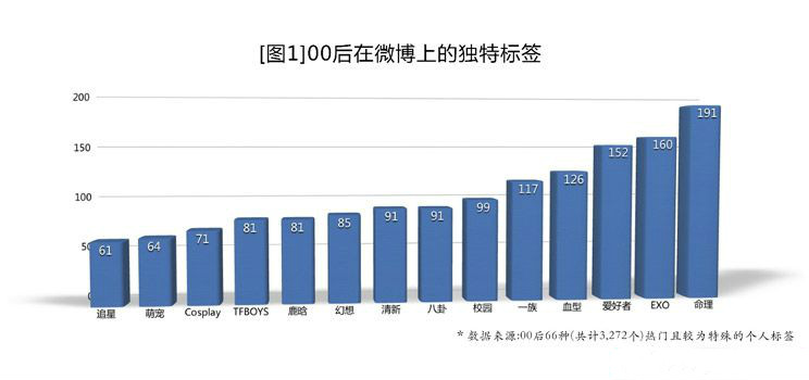 与忠诚于某一品牌相比,零零后更加重视体验和参与。调查显示,在过去十年中,15岁左右青少年对于品牌的忠诚度下降了7%,与之相对的是“个人体验”的重视。比如,对于零零后来说,旅游的乐趣在于自拍,用图片编辑软件来美化,然后发到社交平台上引发议论,而不再是花心思购买旅游纪念品。微博监测显示,“XX爱好者”、“XX一族”等标签在00后的个性化标签中排名靠前[见图1]。而那些具有传奇个人经历、富有故事的人物也往往在传播中拥有较强话语权。