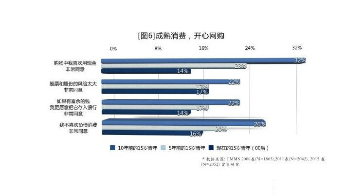 零零后对于媒介的成熟和敏感,使他们对潮流有着理性的判断。相比十年前,当今的零零后对“为时尚而放弃实用性”的赞同率下降了6%。作为与电商共同成长的一代,81%的零零后在微博上提及自己的网购经历,与十年前相比,当今零零后的现金支付意愿下降了18个百分点,储蓄意愿下降了8个百分点,负债消费的接受度上升10个百分点[见图6]。更值得注意的是,他们对潮流的敏感和信息搜集的能力,也使得他们在家庭购物决策中有着重要的话语权。在高科技产品的选择上,越来越多父母会听取零零后的建议。对于家长而言,需要快速了解商品信息,以及用户评论来做出判断;对于孩子而言,方便查找、公信力高的平台也有利于快速挑选商品,并获得家长的首肯。