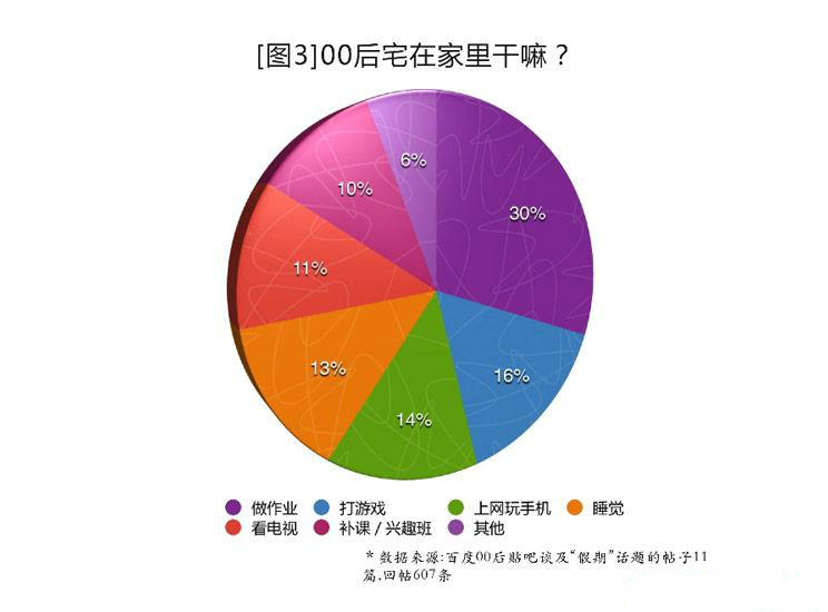 对于即将升入高中的零零后来说,91%的压力来自于学习。然而他们却普遍对此充满信心。调查中, 55%的学生对压力抱有积极乐观态度,其中的22%更表示“要努力面对”[见图2],相当一部分人在繁重的课业之余仍学习其他技能作为自己的特长或在考试时的加分项,如钢琴或者计算机。而互联网的咫尺天涯, 更让零零后成为“宅族”,无论假期长短,70%的人选择留在家中,学习、社交、娱乐,都能在更加舒适的环境下完成。宅在家期间,除了30%的时间用来学习,打游戏和上网玩手机也分别占据16%和14%[见图3]。