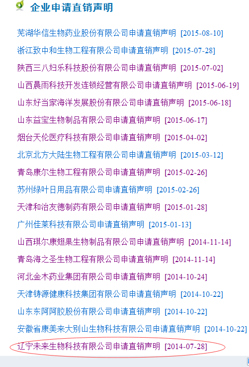 官网信息显示,2015年6月4日,辽宁未来生物科技有限公司获得直销经营许可证,并于8月8日获得国家商务部颁发的直销牌照。已获批直销区域是辽宁省本溪市平山、溪湖、明山、南芬四个区。直销产品目录只有胚元牌元诺胶囊。