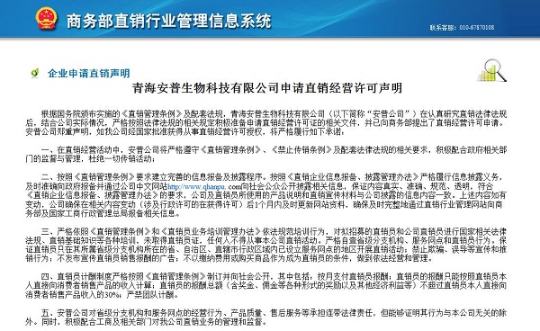 直销行业网讯 9月7日,商务部公示了青海安普生物科技有限公司的直销申请声明。据了解,安普生物科技是青海首家申请直销的企业。沙棘和枸杞是公司的两大主打产品。