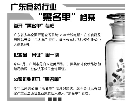 此外,广东省去年全面开通全省系统12331专线电话;在省食药监局网站开设“黑名单”专栏,首批公布违法违规企业或个人信息8例。