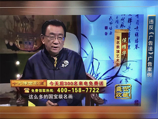 利用知名艺人侯耀华等人员进行涉嫌虚假宣传,提升自身产品影响力。经工商部门调查核实,所谓的“传世名画”只是浙江某工艺品厂生产的丝绸制印刷品。其行为误导消费者并进行虚假宣传。