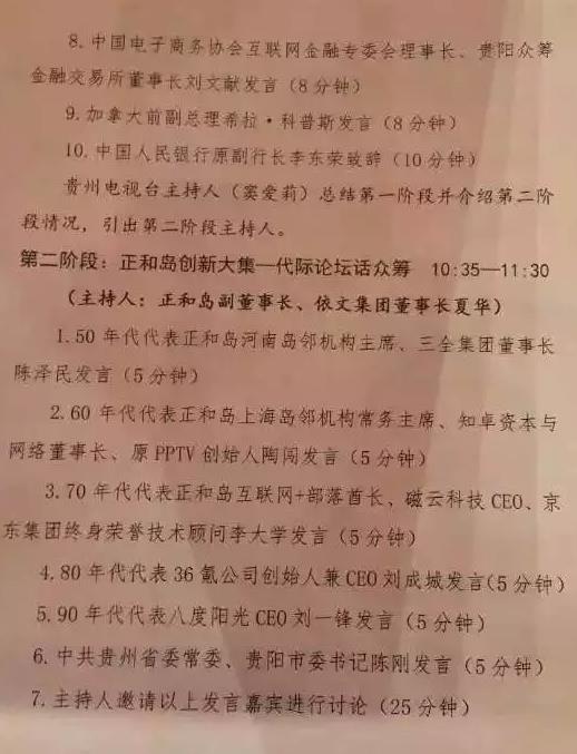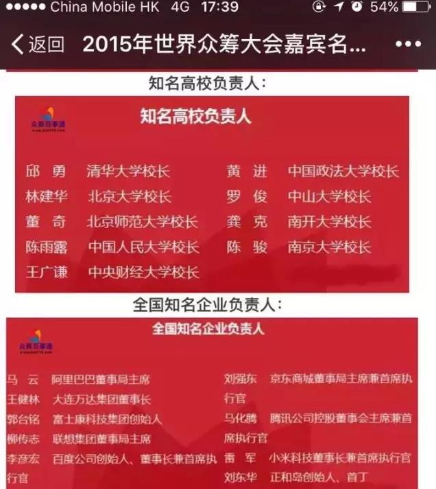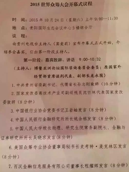 9月份有人给我发广告,说什么世界众筹大会在贵阳召开,我当时还很纳闷说那些推广怎么都整的跟微商一样,当我看到名单的时候,我惊呆了。全是重量级大咖,我是半信半疑,将信将疑。有很多熟人面孔,有许多平台的CEO,平时都认识,圈内抬头不见低头见的朋友都在名单内。