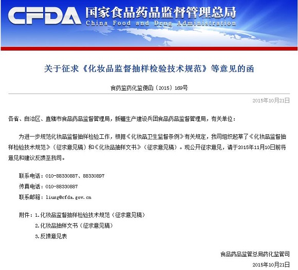 直销行业网讯 10月21日,食品药品监管总局药化监管司组织起草了《化妆品监督抽样检验技术规范》(征求意见稿)和《化妆品抽样文书》(征求意见稿),并开始公开征求意见,征求时间截止至2015年11月10日。