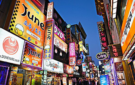 韩国商业购物中心明洞,这里有多家化妆品专卖店。韩国化妆品市场带动韩国经济,尤其是生技公司股票表现特别亮眼。
