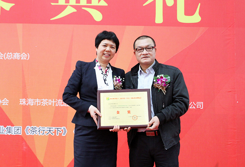 广东省茶叶流通协会副会长梁伟德为完美公司颁发产品“金奖”牌匾
