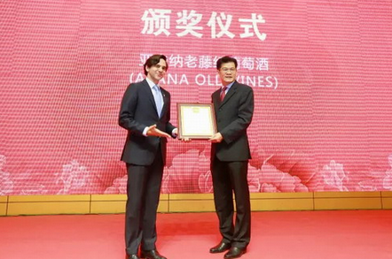 智利葡萄酒联盟亚太区总裁Julio Alonso向胡瑞连总裁颁发葡萄酒荣誉证书