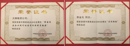 2016年1月22日,中国食品企业社会责任年会于北京钓鱼台国宾馆盛大召开,天狮集团以其多年来在食品安全、履行社会责任等领域所做出的表率作用赢得业界和组委会的肯定,获得“跨国食品企业践行社会责任特别贡献”奖,并入选首届“中国食品企业社会责任百强企业”,李金元董事长荣获“中国食品企业责任领袖奖”。