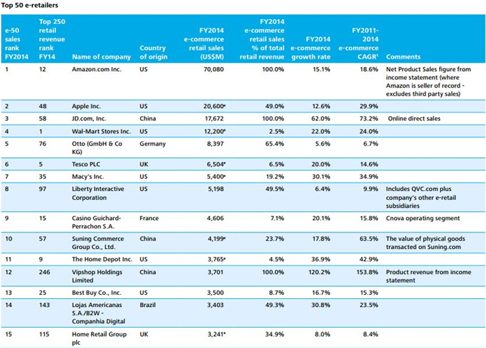 值得注意的是,尽管在全球零售250强中,中国企业仅占5%左右,但在全球电子商务零售商排名前50家的企业中,前15名中有3家中国企业,分别是京东、苏宁和唯品会,他们分别在全球零售250强中,排名58、57和246。