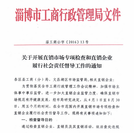直销行业网讯 近日,淄博市工商局发布信息,从4月1日起,市工商局将部署开展为期5个月的直销市场专项检查和直销企业履行社会责任督导工作。