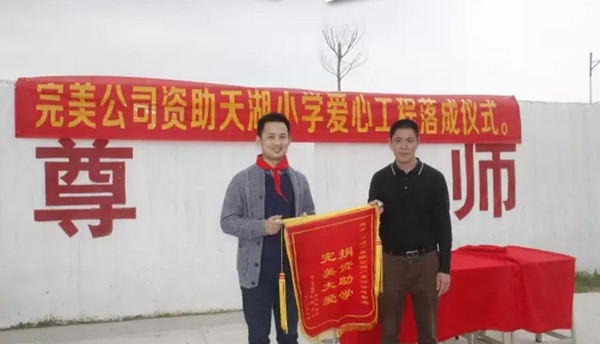 天湖小学校长蔡木腾向完美广东分公司总经理员鹏赠送“捐资助学、完美大爱”锦旗