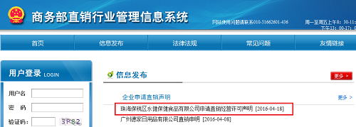 直销行业网讯 4月19日,小编从商务部直销行业管理信息系统获悉珠海保税区永健保健食品有限公司正式向商务部提交申请直销牌照的声明。距离此前广州德家日用品有限公司发布申牌申明仅仅过去10天。详情如下: