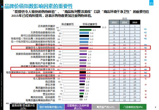 尼尔森发现,消费者在大卖场和超市购物时更加注重购物体验,这将是卖场和超市的优势所在。“能提供令人愉快的购物体验“(86%),“商品陈列整洁美观”(86%),“商店环境干净卫生”(90%),这三项因素在购物者心目中的重要性提升也证实了这一点。相比2014年的数据,三项因素的重要性排名分别提升了6位,6位及9位。与此同时,店员服务质量好(94%),产品丰富多样(92%),方便到达(90%)仍旧是消费者最为关注的因素。
