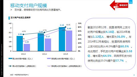 根据中国电子商务信息中心的最新数据显示,截至2015年12月,我国使用网上支付的用户规模达到4.16亿,较2014年底增加1.12亿,增长率达到36.8% 。与2014年12月相比,我国网民使用网上支付的比例从46.9%提升至60.5% 。值得注意的是,2015年手机网上支付增长尤为迅速,用户规模达到3.58亿,增长率为64.5%,网民手机网上支付的使用比例由39.0%提升至57.7% 。尼尔森的调研数据同样验证了中国消费者网购向移动数字端转移的趋势,数据显示,同去年相比,使用移动支付软件网购者的比例从去年的96%上升至今年的99%,移动支付软件的普及程度几乎覆盖了所有的网购用户。
