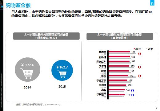尼尔森最新的《2016年度中国卖场超市购物者趋势报告》结果显示:2015年大卖场和超市的渗透率略有回升,相较于2014年分别提升了2个百分点和1个百分点,有78%及82%的受访者表示在过去一个月内曾光顾大卖场及超市,相比其他现代渠道,优势仍然较为明显。消费者购物频率也保持稳定,但平均购物篮金额从2015年的172.4元下降至162.7元,反映因为“大量囤货”而进行的购物有所减少,受访者定期的大型采购由2014年的24%下降至22%,更多的还是为了家中一般性补货(38%)。数据显示,便利店和网购的渗透率分别从去年的32%和19%上升至38%和35%。