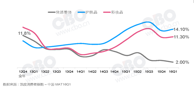 从2012年Q4开始,快消行业整体增长放缓,2016Q1增长率跌至2.0%。而护肤品和彩妆却持续快速增长,截至2016Q1,护肤品增长率达到14.10%,彩妆增长率也高达11.30%,双双破十。
