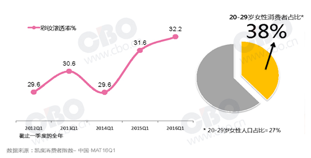 一是彩妆将会是驱动化妆品市场的品类。根据凯度消费者指数提供的数据,彩妆的购买人数三年来持续增长。在我国消费者总人数中,有约30%的人口有消费彩妆的能力,但是这一数据在韩国占到80%。考虑到我国总人口和潜消费习惯的进化,彩妆市场应得到应有重视。