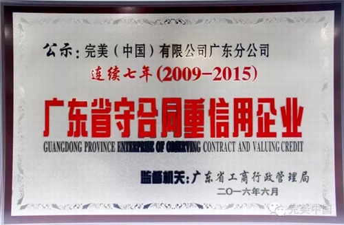 广东分公司秉承完美公司诚信经营的理念,推进企业诚信体系建设,营造企业内部良好的信用环境。连续七年荣获“广东省守合同重信用企业”称号,这是政府和市场对广东分公司的认可和肯定。在今后的发展中,广东分公司将继续恪守法规、诚信经营,构筑更加可靠的诚信体系。