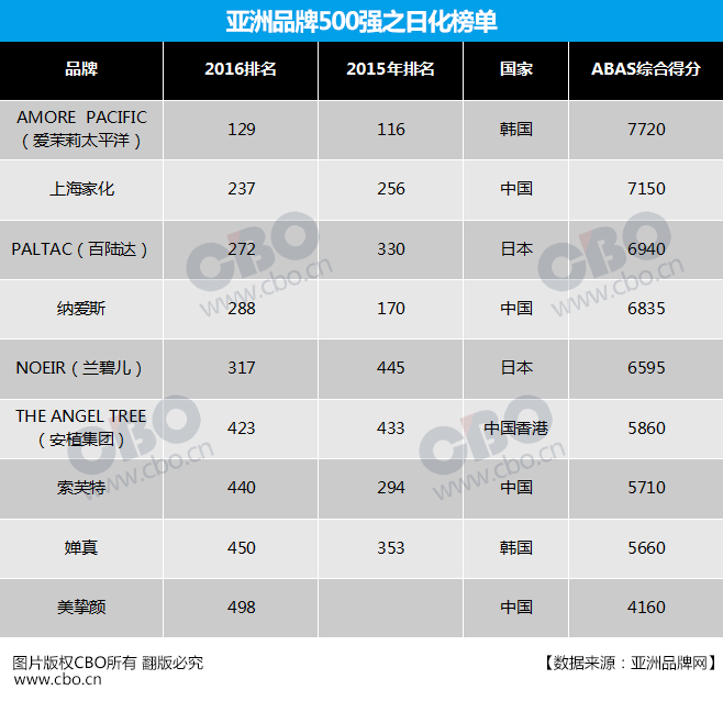 从榜单看,韩国爱茉莉太平洋以7720的综合得分在亚洲500强日化榜单中排名第一;其次是上海家化,ABAS综合得分为7150,第三是日本的百陆达,分数达6940。