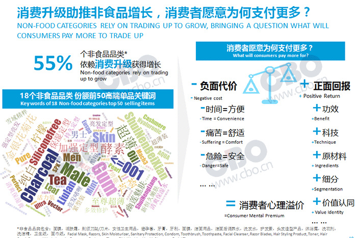 尼尔森数据表明,有55%的非食品品类正依赖消费升级获得增长。消费者对产品功效、原材料、安全性、便利性和舒适度的要求更高,并且愿意为这些需求买单。