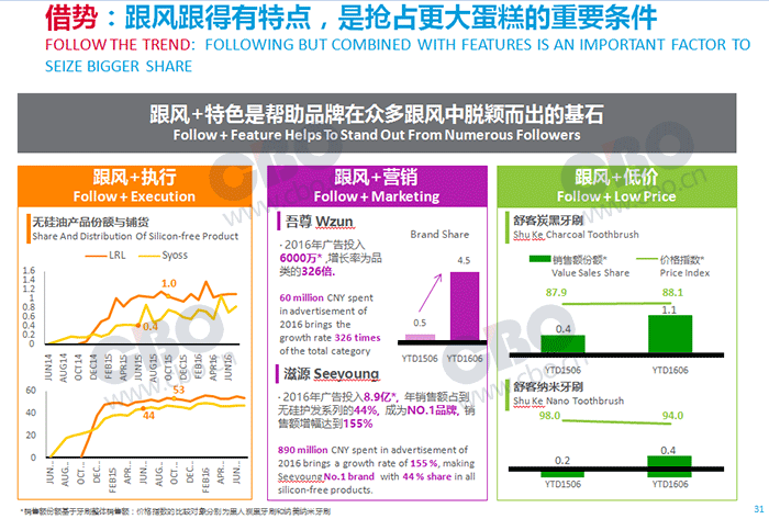 唐东认为,品牌跟风热门卖点,再加上自己的在铺货、营销、价格方面的特色,就能从众多跟风中脱颖而出。两个鲜明的例子是吾尊和滋源,它们十分擅长于跟风卖点加上高举高打的营销模式,并且这种模式成绩斐然。吾尊2016年的广告投入为6000万元,并也在上半年达到男士品类4.5%的市场份额;滋源2016年投入8.9亿元广告,其年销售额占到无硅油护发市场的44%,成为该品类第一名,销售额增幅达155%。