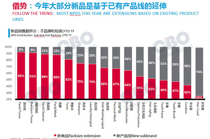尼尔森数据显示,在今年上半年,洁面、面膜、洗护、润肤、口腔等9个品类中,大部分新品为新单品而非新产品线,也就是说,今年大部分化妆品新品是基于已有产品线的延伸。