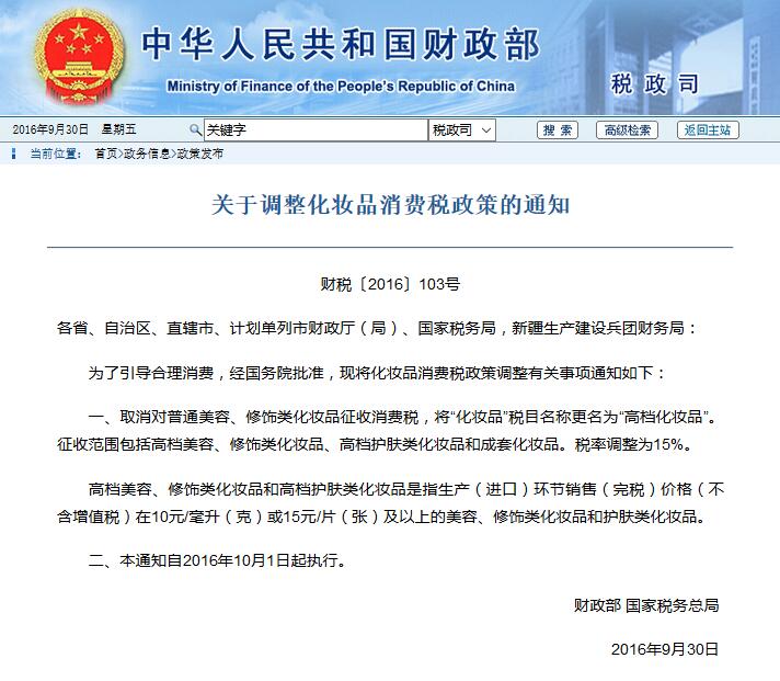 直销行业网讯 据财政部网站30日消息,财政部、国家税务总局发布通知,取消对普通美容、修饰类化妆品征收消费税。