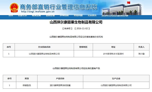 直销行业网讯 11月2日,从商务部官网获悉,山西琪尔康翅果生物制品有限公司获得第79张直销牌照,成为山西省首家获牌直销企业。据显示,琪尔康获批准的直销产品是琪尔康牌翅果油软胶囊 。
