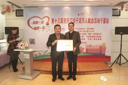 启动仪式上,完美宁夏分公司获颁“无偿献血爱心单位”荣誉牌匾。来自全区246名爱心人士报名参加献血,活动现场温馨感人。“这是我第一次参加完美公司组织的献血活动,但自己平时有参加义务献血。”参加此次公益活动的朱军安说,每一个人都有责任和义务,去贡献自己的力量,帮助别人。已经参与过5次献血活动的付志东说:“几百毫升的血,未来却可能是对一个生命的延续。完美健康理念,让我有能力献出这份爱心。”