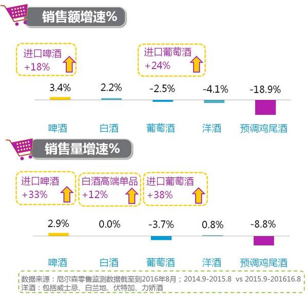 尼尔森零售监测数据显示,截止到2016年8月份,中国酒类市场在现代零售渠道总体表现稳定。白酒整体销售量与去年持平,然而售价在每瓶500元(500ml装)以上的高端单品销量异军突起,显著增长了12%,帮助白酒品类销售额增长2.2%。进口啤酒和进口葡萄酒仍旧保持活跃增长态势,销售量分别增长33%和38%。而过去几年增长迅速的预调酒品类则面临较大程度的下滑。
