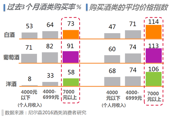 《尼尔森2016酒类消费者研究》报告显示,30-39岁的中产阶级人群仍然是白酒市场的主力消费者。和以往相比,中产阶级消费者更愿意在如何提高生活品质和身心健康等方面增加花费,他们不仅买得更多,而且买得更贵。