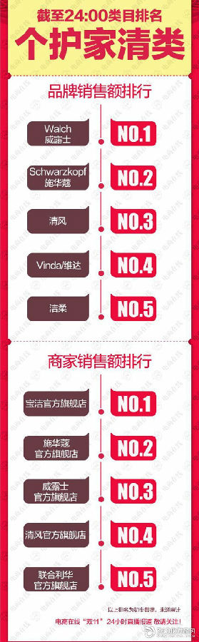 直销行业网讯 双十一已经过去,总结还在,双十一期间,个护家清类销售排行榜出炉,威露士,施华蔻,清风前三。下面是具体榜单。