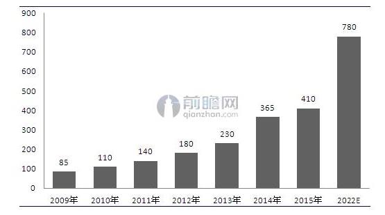 根据前瞻产业研究院发布的《中国药妆行业分析报告》统计显示,2009年,中国化妆品市场销售额为800亿元,其中药妆市场销售额为80-100亿元,约占化妆品市场销售额的8%。2013年,中国药妆市场规模增长是230亿元左右。中药化妆品作为药妆品中的一个新生力量,目前正处于快速成长期。2015年,中国药妆市场规模达到410亿元。前瞻分析预计到2022年,中国药妆市场规模将达到780亿元。