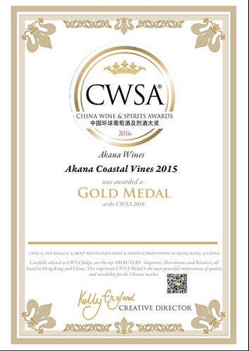 2016年CWSA金奖——亚卡纳海岸白葡萄酒获奖证书