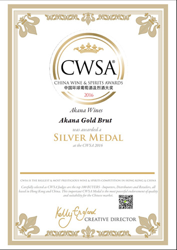 2016年CWSA银奖——亚卡纳金装起泡葡萄酒获奖证书