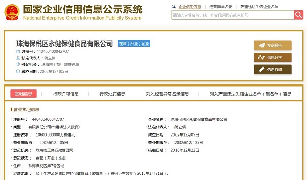 据资料显示,珠海永健成立于2002年,注册资金10600万香港元,法人代表是简立信。其经营范围是加工生产及销售自产的保健食品。据了解,珠海保税区永健保健食品有限公司是NU LIFE(安永)的全资子公司,于1991年由简立信及简志伟博士创立。NU LIFE是亚洲区一家著名的网络营销公司,其于2011年荣获了Mediazone评选为香港最有价值企业及年度全人健康大奖,目前已经拓展至全球十多个国家及地区。